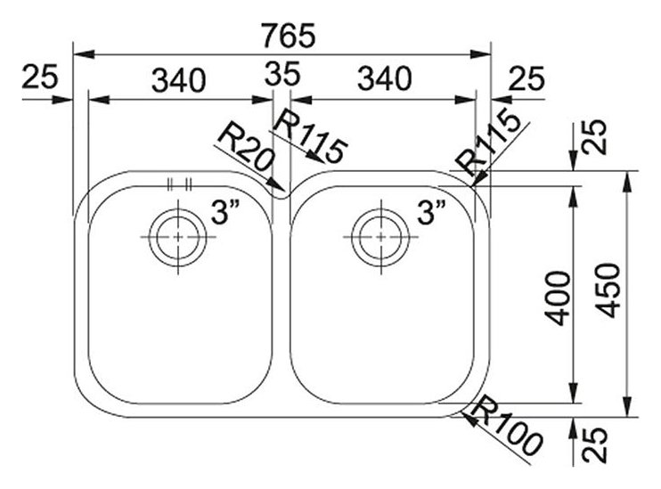 Lunghezza vasca: 2x 340 mm