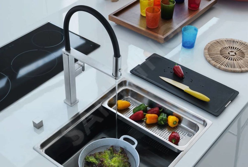 La finitura dei miscelatori acciaio inox è progettata per integrarsi perfettamente con le vasche Franke Mythos, Franke Box, Box Center, Planar e Maris, offrendo un connubio armonioso nel design.