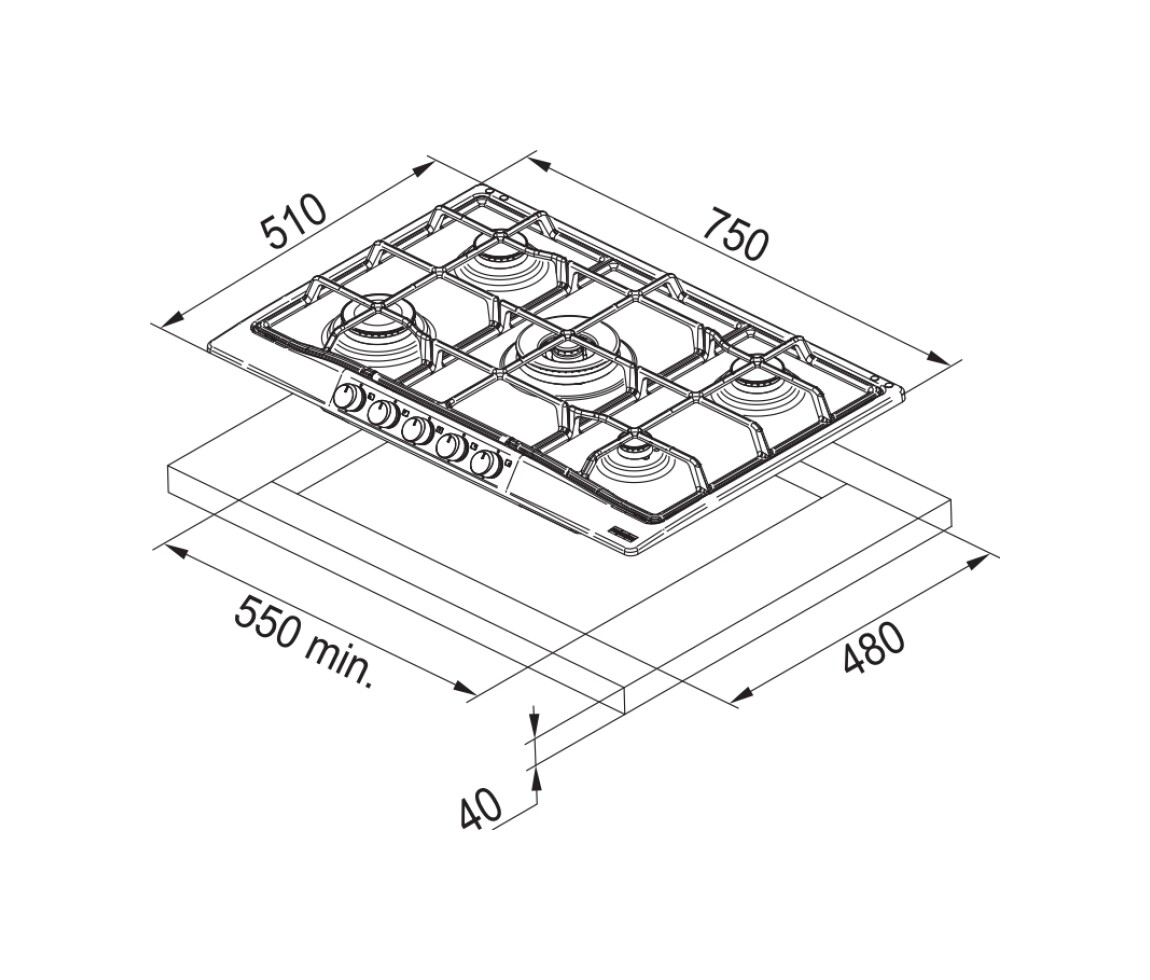 Con una superficie di lavoro di 750×510 mm e un foro incasso di 550×480 mm, questo piano cottura a gas offre un ampio spazio per esprimere la tua creatività in cucina. Il design sofisticato in black matt aggiunge un tocco di eleganza moderna alla tua cucina, integrandosi armoniosamente con lo stile circostante.
