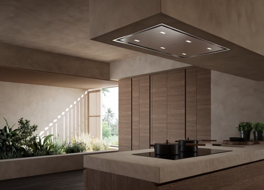 Come suggerisce il nome, la cappa è installata direttamente nel soffitto, una scelta sobria che libera spazio nella tua cucina, fornendo un’elegante combinazione di funzionalità e design.