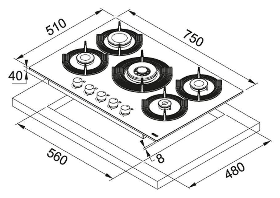 Dimensioni: 750×510 mm, donando al piano cottura una presenza imponente e raffinata.