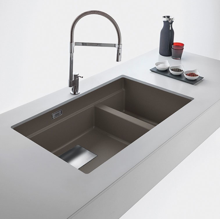 Il lavello in fragranite della serie Kubus si installa con eleganza anche sottotop, accentuando la pulizia funzionale del piano di lavoro.