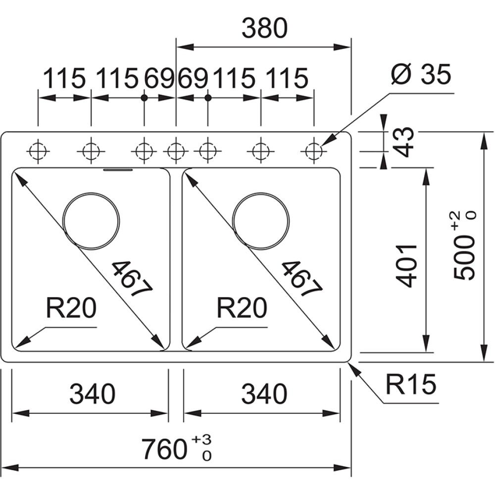 Larghezza vasca 2x 398 mm