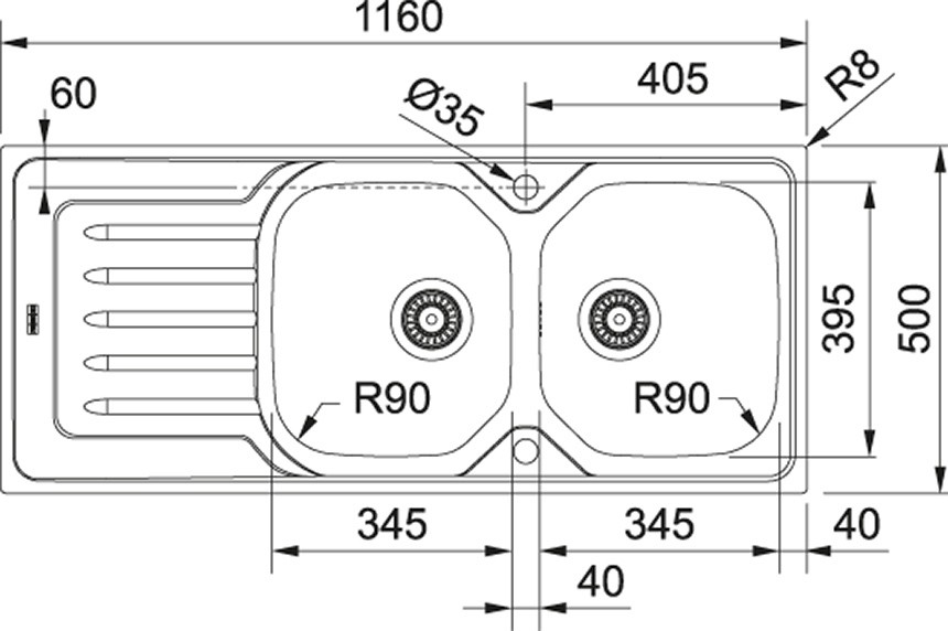 Lunghezza vasca piccola: 160 mm