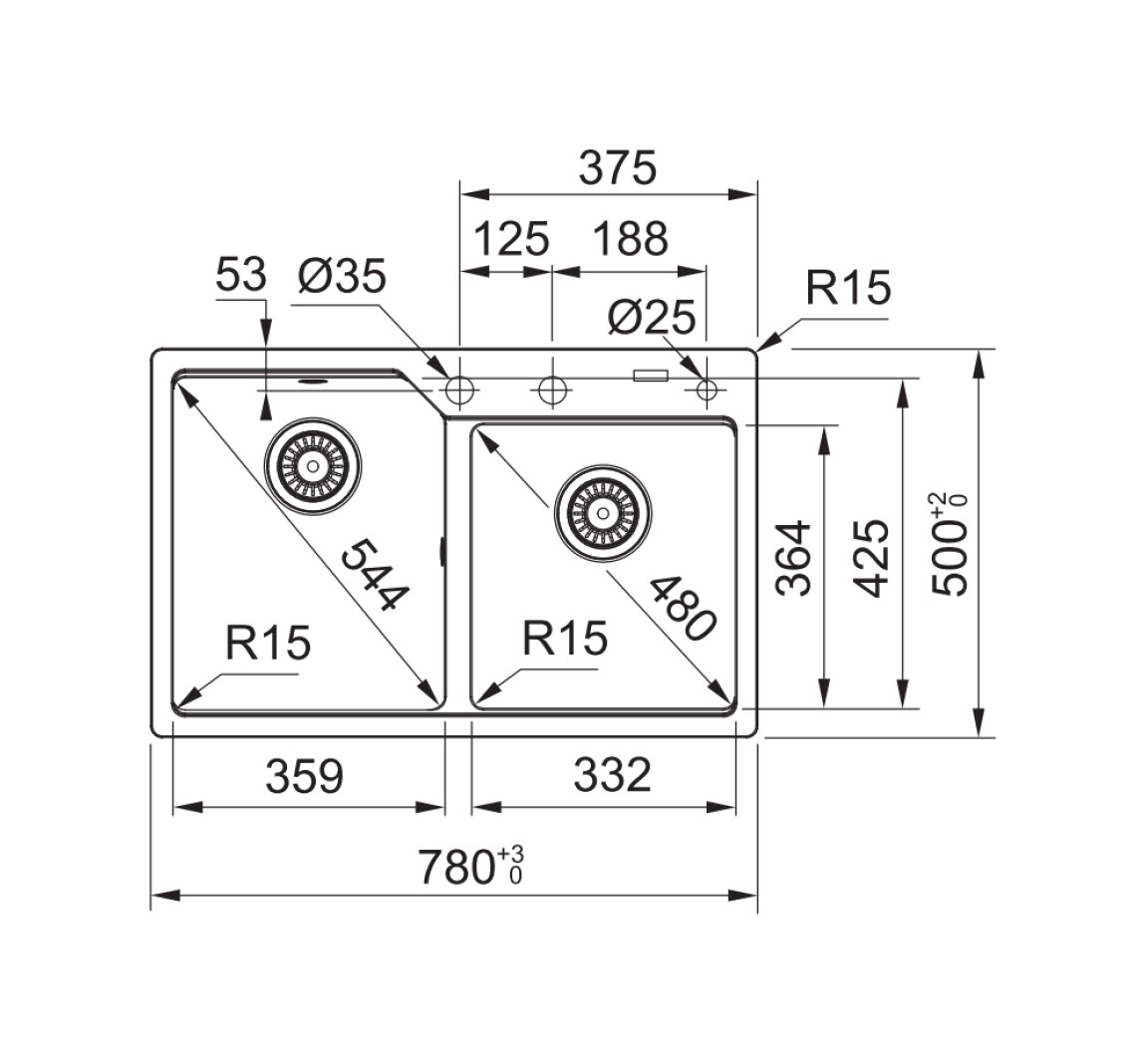 Larghezza vasca grande: 425 mm