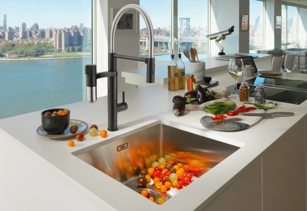 Design compatto, integrato direttamente nel miscelatore, risparmiando spazio sotto al lavello.